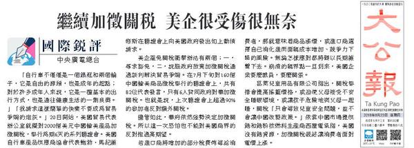 央视网消息:中央广播电视总台“国际锐评”8月22日刊播题为《继续加征关税?美国企业很受伤很无奈》的文章,多家境外媒体转载或引用。