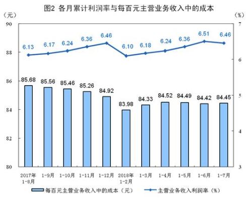 另外,1-7月份,规模以上工业企业实现主营业务收入60.5万亿元,同比增长9.9%;发生主营业务成本51.1万亿元,增长9.5%;主营业务收入利润率为6.46%,同比提高0.4个百分点。