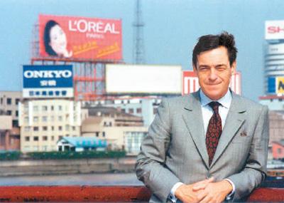 图为时任欧莱雅集团CEO欧文中先生在上海外滩具有象征性的欧莱雅广告牌前留影。欧莱雅集团提供