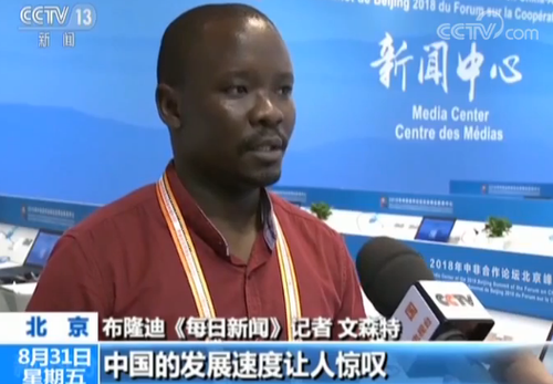 布隆迪《每日新闻》记者 文森特:我来中国报道过很多次,也去过很多城市,中国的发展速度让人惊叹,这次峰会我们会持续关注,中非领导人在中非经贸、科技等领域的合作。也期待能达成更多务实成果。
