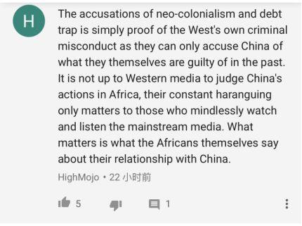 所谓“新殖民主义”和“债务陷阱”的指控正是西方自身罪行的证明,他们只能用自己犯过的罪行来指责中国。中国在非洲的行为不是由西方媒体来评判的,只有盲目听信西方主流媒体的人才会在意。真正重要的是,非洲人自己怎么看他们同中国的关系