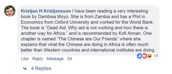 我在读丹比萨?莫约写的一本非常有趣的书。她来自赞比亚,在牛津大学获得经济学博士学位,曾在世界银行工作。这本书叫《援助的死亡》,讲的是为什么对非援助不起作用,而非洲还有另一条路可走??品?安南也推荐了这本书。其中有一章叫做《中国人是我们的朋友》,她说中国在非洲的做法常常比西方国家和国际组织要好得多。