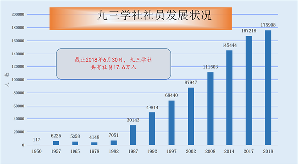 截止2018年6月30日,九三学社社员总数为175908人,比上年同期净增8690人,增幅为5%,是40年前改革开放之初的42倍。根据公开资料显示,目前,成员最多的民主党派为民盟29.5万人,其次为民建18.4万人,九三学社排名第三。
