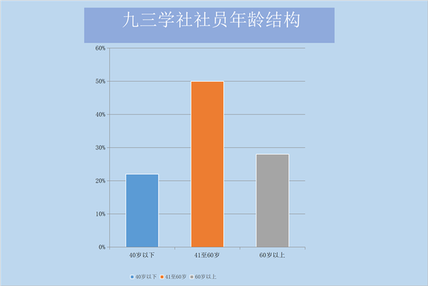 九三学社社员平均年龄54.66岁。其中,40岁以下社员占比22%,41至60岁社员占比50%,60岁以上社员占比28%,年龄结构呈橄榄型。