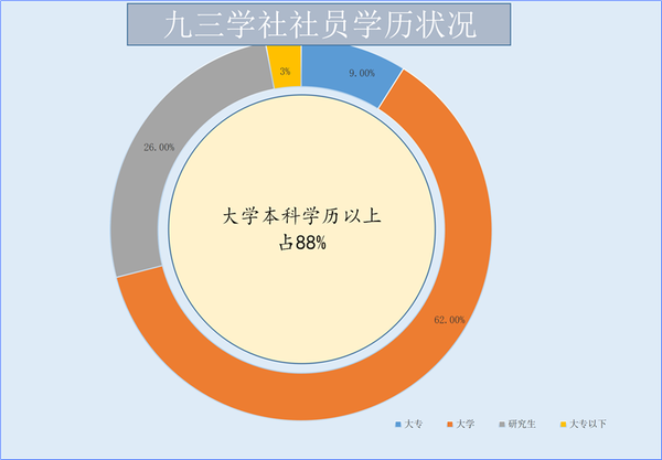 根据2017年底的统计数据,九三学社社员62%的人为大学本科学历,26%的人为硕士或博士研究生学历,12%的人学历为大专以下。