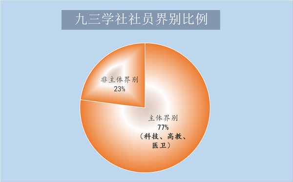 九三学社主体界别为“科学技术”、“高等教育”和“医药卫生”三方面。目前,这三方面共占比77%,主体界别突出,党派特色明显。包括财经、法律、政府机关等行业在内的非主体界别共占比23%,是主体界别的有益补充。