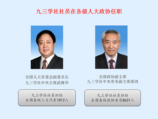 民主党派成员担任各级人大代表、政协委员,在参政议政、民主监督、政治协商中履行民主党派的基本职能,是党派工作的重要方面,也是党派成员的重要职责。截止目前,共有1812名九三学社社员在全国、省、市、县担任各级人大代表,8631名担任各级政协委员,拥有国家领导人两名。