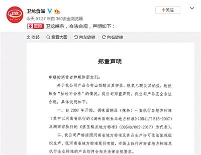 昨日凌晨,卫龙公司认证微博“卫龙食品”发布声明,回应关于其公司产品含有山梨酸及其钾盐和脱氢乙酸及其钠盐,致使辣条“抽检不合格”的情况,称其公司产品“完全合法合规”。