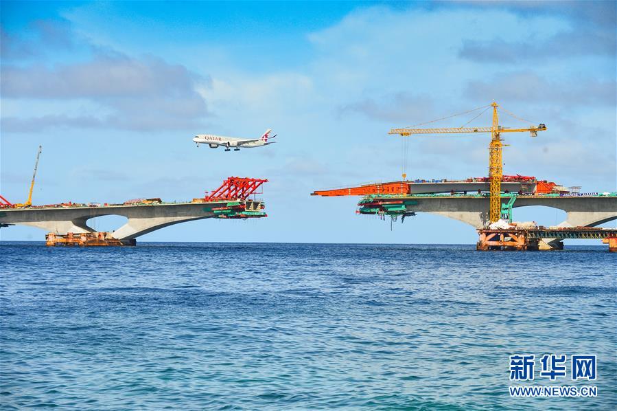 2018年6月24日,位于马尔代夫的中马友谊大桥主桥20号墩至21号墩之间的钢箱梁正在顶推。新华社发(杜才良 摄)