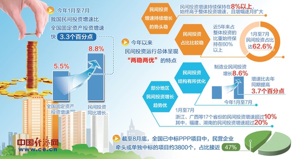 “两稳”,一是民间投资增速持续增长的势头稳。今年以来,民间投资增速持续保持在8%以上,始终高于整体投资增速,且增幅逐月扩大;二是民间投资占比稳,近5年来占整体投资的比重始终保持在60%以上,今年1月至7月,民间投资占全部投资的比重达到62.6%。