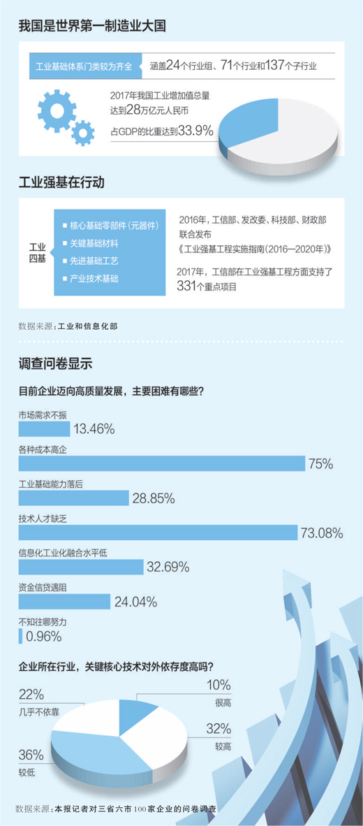 “要实现从‘有’到‘好’的转变,在高端产品上突破,还需要时间。”调查中企业坦言,我国部分核心技术、关键产品和重大装备仍存瓶颈制约,一些工业产品在一致性、稳定性和使用寿命方面与国外先进水平差距较大,工业基础须进一步夯实。