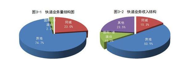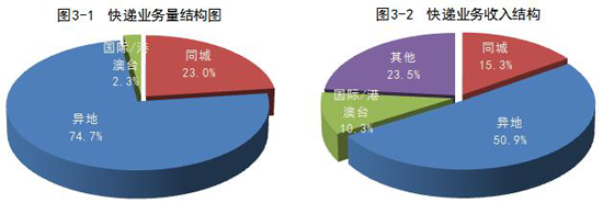 1-8月,同城、异地、国际/港澳台快递业务量分别占全部快递业务量的23%、74.7%和2.3%;业务收入分别占全部快递收入的15.3%、50.9%和10.3%。与去年同期相比,同城快递业务量的比重下降0.4个百分点,异地快递业务量的比重上升0.2个百分点,国际/港澳台业务量的比重上升0.2个百分点。