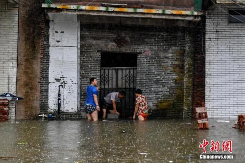 9月17日,广东江门台山大江镇侨园新村,民众使用铁板抵挡家门口的积水。中新社记者 陈骥旻 摄