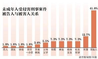 新京报记者注意到,在未成年人受侵害刑事案件中,被告人与被害人之间是陌生人的占比41.8%,而其余近六成案件则是存在有同事关系、师生关系、邻居关系、亲属关系、恋人朋友关系、甚至父母子女关系等密切关系的“熟人作案”,其中通过微信交友占比7.3%。