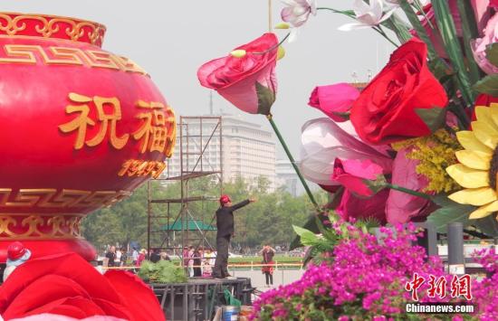9月20日,北京天安门广场上,吊车正在吊装国庆主题庆?;ɡ骸白8W婀?,花篮已经显露雏形。中新社记者 贾天勇 摄