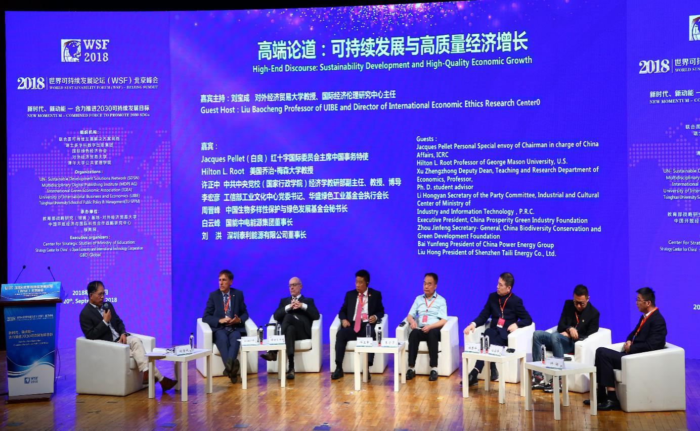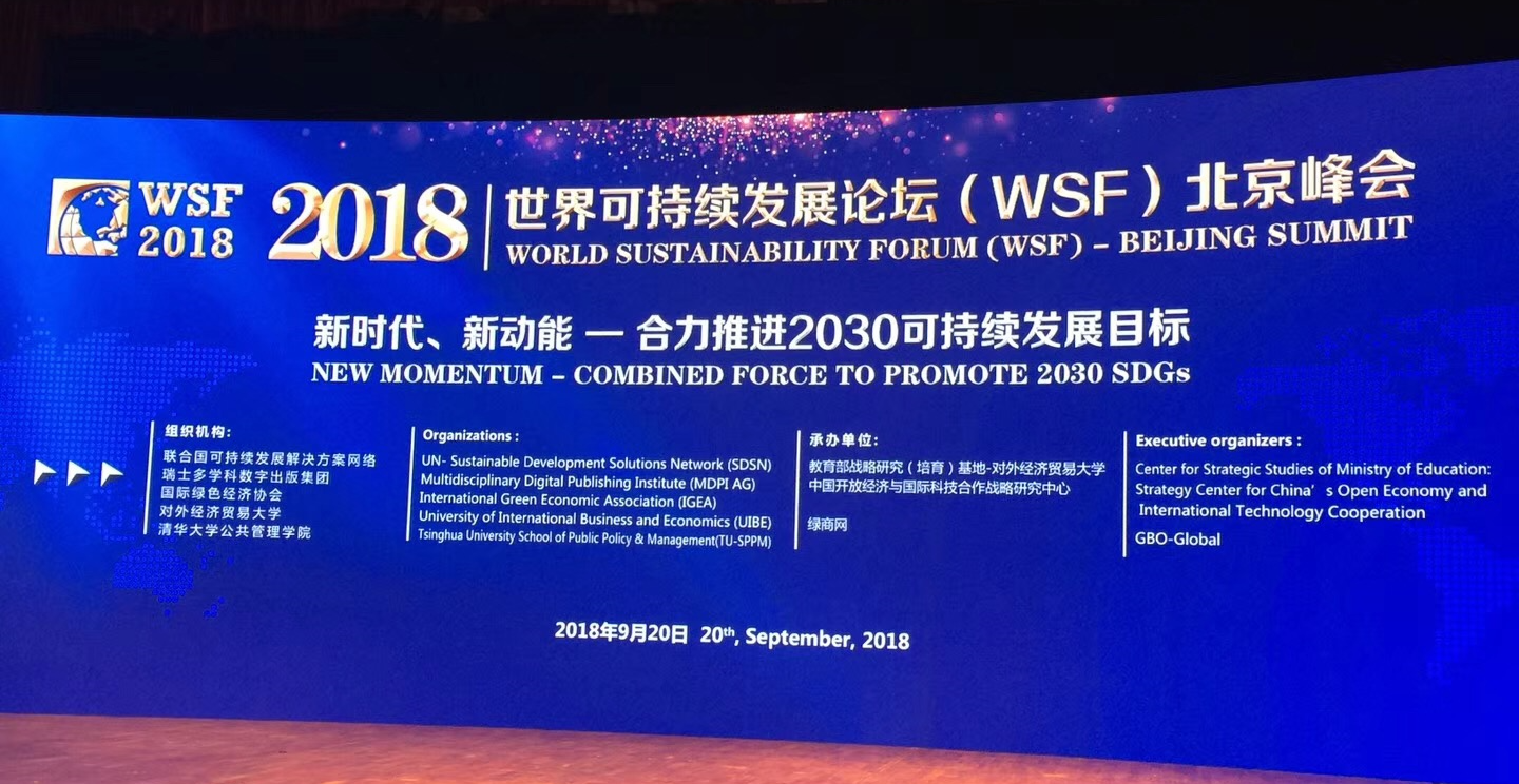 2018年9月20日,由联合国可持续发展解决方案网络(UNSDSN)支持,绿色经济协会、对外经济贸易大学、瑞士多学科数字出版集团(MDPI AG)联合主办的世界可持续发展论坛“World Sustainability Forum(WSF)”2018北京峰会(简称WSF2018北京峰会)在中国北京开幕,峰会以“新时代、新动能—合力推进2030可持续发展目标”为主题。来自全球20多个国家的学者和工商企业500人左右出席了会议,围绕联合国2030可持续发展目标(SDGs),以非政治和非政府间的形式展开交流和讨论,挖掘各学科、各行业关于可持续发展的解决方案,并通过联合国可持续发展网络的平台,向全球产学研界分享和推广。