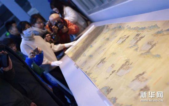 《丝路山水地图》上世纪30年代左右曾流失日本,现由世茂集团董事局主席许荣茂出资2000万美元从私人收藏家手中收购,并将之无偿捐赠给故宫博物院。(来源: 新华社客户端)