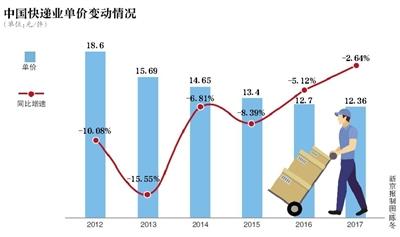 国家邮政局公布的最新快递行业运行数据显示,8月行业单价为11.91 元。而这一数字在2015年是13.4元,2014年是14.65元,2013年是15.69元,2012年是18.6元。