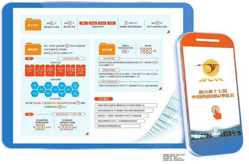 本届西博会首次实行“一城双展”,分别在世纪城和西博城办展,也是首次在西博会永久会址——中国西部国际博览城举办,展览总面积达26万平方米,为历届之最。展览的国际化、专业化、市场化水平大幅提升。数据显示,共有95个国家(地区)参会参展,其中,有80个国家(地区)参展,朝鲜、阿根廷、乌拉圭、秘鲁等国家首次参展。29个省(区、市)和新疆生产建设兵团组团参展,展示全国各地改革开放的丰硕成果;超过100家世界500强及知名企业参展?;窆艺铰?西博会特别开辟了“一带一路”合作馆,吸引了沿线31个国家和地区参展,展览面积10万平方米,占总面积的38.5%?;咕侔臁耙淮宦贰弊ㄌ庀盗谢疃?项,得到境外嘉宾充分肯定及高度认可。