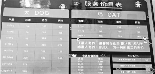 店里除了宠物商品区,还有宠物洗澡、美容区,宠物寄养区,宠物售卖区。宠物寄养服务会根据宠物大小区分,还分标准间、豪华间等,价格在78~168元/天。宠物造型服务有洗澡和美容,根据宠物的体重、毛长不同而收费不一,犬类价格160~460元,猫类258~400元。不同的店还会有不同的个性化服务,如局部美容修剪等。
