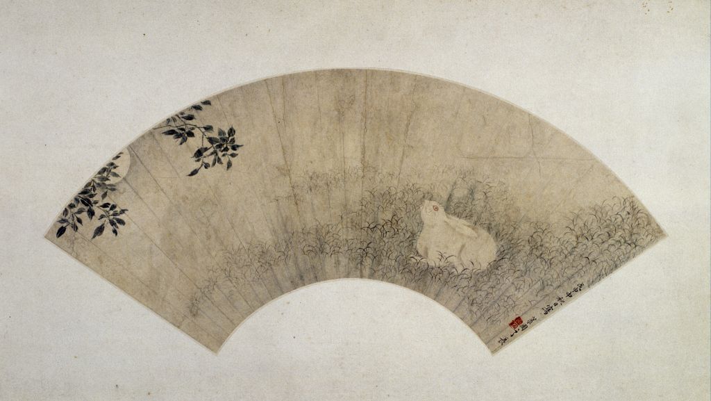 在清代李世倬绘《桂花月兔图》纸本扇页中,即表现一只白兔居于画面主体,通过其仰视的目光,可见左上角被桂树叶遮掩的半个月亮。白兔形象生动、憨态可掬,与桂花和明月之间的关系,以及它们之间内在的美好传说尽显纸上。