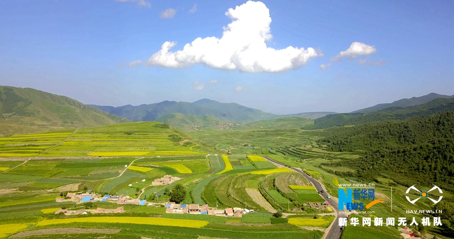 资料图 航拍榆中县马坡乡油菜花海。新华网(王生元 摄)