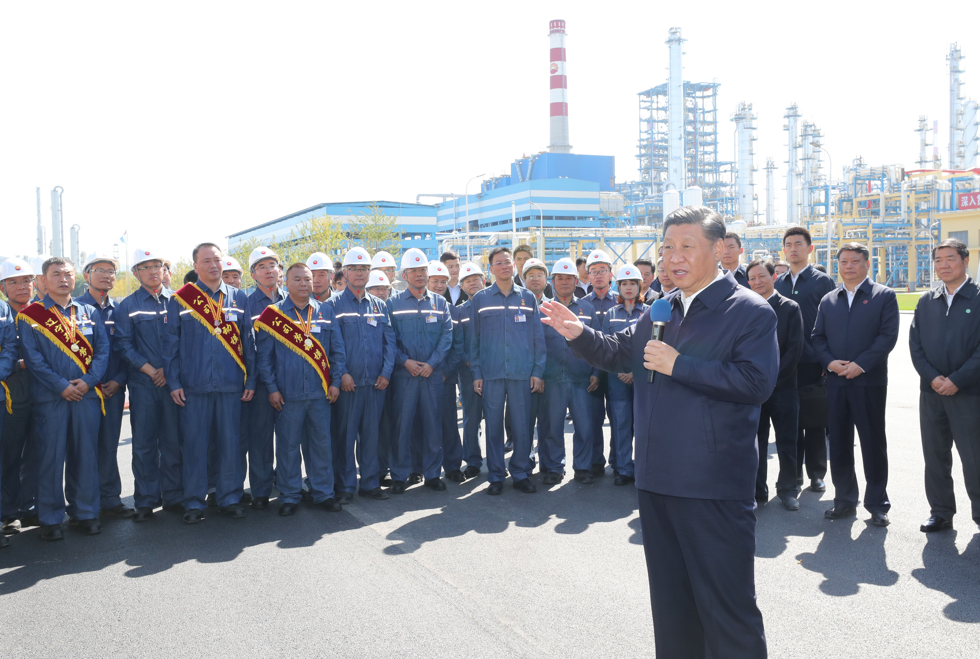 9月25日至28日,中共中央总书记、国家主席、中央军委主席习近平在东北三省考察,主持召开深入推进东北振兴座谈会。这是27日上午,习近平在辽宁中国石油辽阳石化公司同工人亲切交流。新华社记者 鞠鹏 摄
