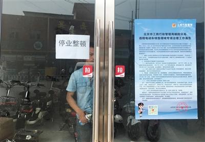 7月1日,十里河一家电动车销售店大门上贴着停业整顿和违规电动车销售领域专项治理工作通告。新京报记者 王贵彬 摄