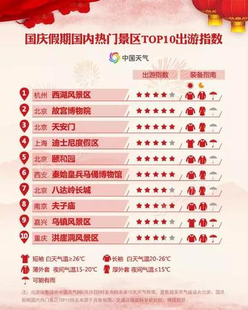 通过梳理,西湖、故宫、夫子庙、迪士尼等景区被评国庆假期国内十大热门景区,那么,这些景区天气如何?出行又该准备哪些装备呢?