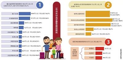 其中,前门大街接待18.0万人次,同比减少14.3%;什刹海风景区接待17.2万人次,同比增长0.6%;故宫博物院接待8.0万人次,同比减少8.0%;颐和园接待7.2万人次,同比减少2.0%;乐多港假日广场接待5.0万人次,同比增长21.0%;北海公园接待4.5万人次,同比减少15.6%;中国科技馆接待4.4万人次,同比增加21%;圆明园公园接待4.28万人次,同比增加16.6%;天坛公园接待4.2万人次,同比减少45.3%;大运河森林公园接待3.8万人次,同比增加18.8%。