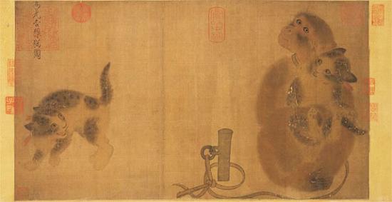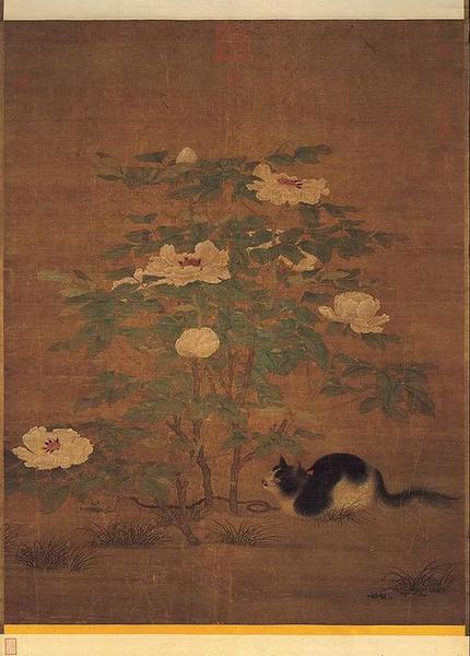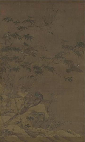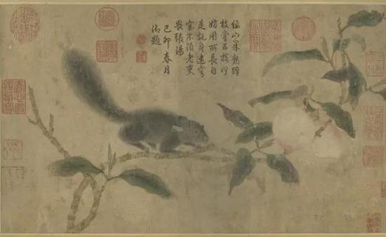 花鸟画中,则展示了宋易元吉《猴猫图卷》、宋人《翠竹翎毛》、宋人《富贵花狸》、元代钱选《桃枝松鼠》等。宋代花鸟画的主流面貌是写实的,因为在宋代画院花鸟画家无不写生。除了写实,画院花鸟画为了起到“富丽堂皇”的装饰效果,画面色彩多浓艳,从《翠竹翎毛》、《富贵花狸》中就可看出。而元代钱选一改花鸟画的浓艳富贵,转而吸收水墨花卉的技法,画面淡雅古拙,《桃枝松鼠》就是其艺术特色的一例。