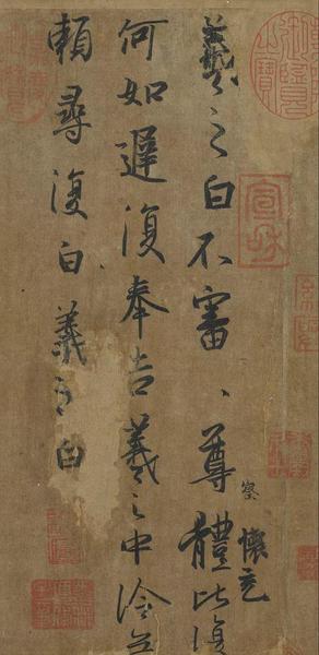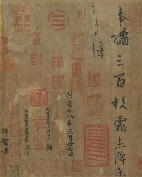 王羲之的《平安》、《何如》、《奉橘》三帖均为尺牍,被装裱在一个手卷之中, 前隔水有宋徽宗题款“晋王羲之奉橘帖”。但此三帖并非王羲之真迹,为双钩摹本。米芾《书史》中记载“又有唐摹右军帖,双钩,蜡纸摹。末后一帖,是‘奉橘三百颗,霜末降,未可我得’。韦应物诗云:‘书后欲题三百颗,洞庭更待满林霜’。盖用此事??适四耆露呷眨尉恐罡鹩?、咨议参军开府学士柳顾言、释智果跋其尾?!?/p>