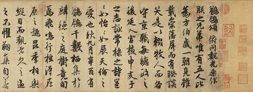 书信的开头提到:“非才当剧”(我不是人才却担当大任)这句话,透露出米芾第一次出任地方行政首长,戒慎恐惧的心情。然而,在诗中米芾也回忆起数年前与朋友相聚,共游山川、玩赏文物,或是雅集盛筵的欢乐情景。这种闲适自得的心情,与即将接踵而至的繁忙政事,形成强烈的对比。