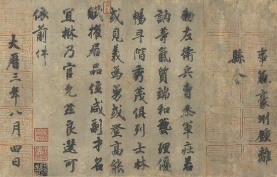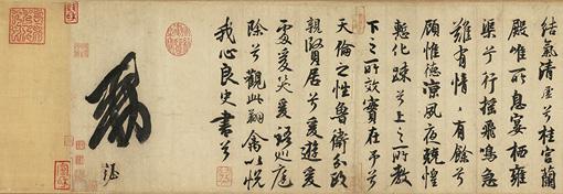 展览中,一直被视为唐玄宗李隆基唯一存世的书法真?!耳W鴒颂》。文中描写了当时宫廷里的情景。某年九月,一千余只鶺鴒飞到宫廷庭院游玩,过了十天这些鶺鴒仍不离去,最后终于亲近得连在旁边拍手它们也不会飞走,于是玄宗邀请了五位臣子在这金秋季节共同度过了愉快的一天。后面又有蔡京、蔡卞、王文治等人的题跋,还有众多重要的收藏印。宋人赵明诚《金石录》中记载:“唐鶺鴒颂,明皇撰并书?!?/p>