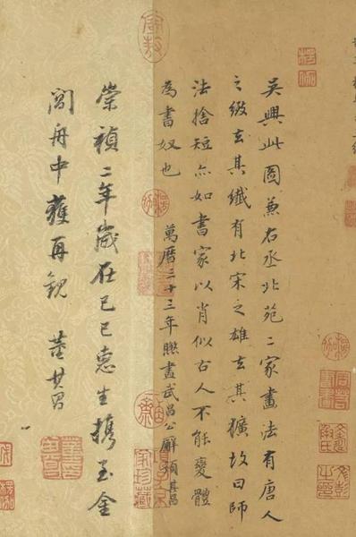 有意思的是,此卷又和乾隆皇帝有着“欢喜冤家”般的故事。乾隆十三年(1748),乾隆皇帝巡狩济南,闲暇里登上城门远眺,觉得这一带景色似曾相识,突然回想起这是《鹊华秋色图》中的景色,心中大喜。他连忙急命飞骑去京城禁中取来,对着鹊、华二山展卷对观,一番赞叹不绝之后,发现所画之景与现实中不相符,于是将此卷深藏内府,不复观。然而当他再次巡幸济南时,又一次想起了宫中的《鹊华秋色图》。面对美景,念及名画,他早已把上次的事忘得一干二净,于是下旨又一次派人回宫取画,且又在画上题写了“深情”的一跋。