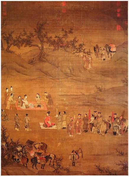 宋陈居中《文姬归汉图》描绘了汉末女诗人蔡文姬在兵乱中流落匈奴,后为曹操赎回的故事。图中土冈沙丘,疏枝衰草,汉使列队迎候,左贤王即席饯别,二子牵衣不舍,人物神情细致生动,仪态肃穆庄严。衣纹用铁线描, 严谨精工, 风格古朴。