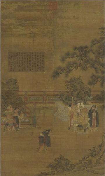 宋人《却坐图》也是类似的故事,讲的是袁盎劝谏汉文帝帝宠妃慎夫人要尊卑有序的故事。画中人物的描绘精微备至,人物面部神态毕现。