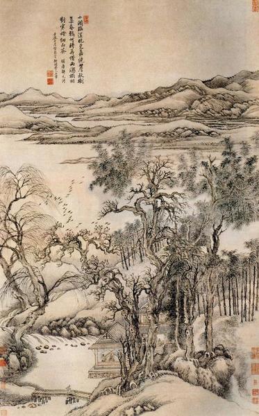 董其昌作画萧疏雅淡,虽然合了倪瓒“逸笔草草”的审美规范,但他何尝不想有高超的写实手法,他赞赏米家山水,却不去学它,原因是容易使笔墨轻率,开护短门径。王时敏、王鉴都是董其昌路线的忠实实践者,王时敏有着董其昌的清逸气,在笔墨的复杂性上胜董其昌一筹,王鉴似乎又胜王时敏一筹。因此,他们共同的审美理想是:既要有浓重的元代文人格调,又不能丢弃宋代的写实情怀。年轻的王翚正合其意。