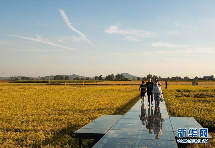 在吉林省舒兰市,游人在稻田间行走(9月19日摄)。 新华社记者 许畅 摄