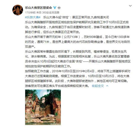 乐山大佛胸腹部开裂残损区域抢救性保护前期研究及勘测工作于当天正式启动。出于安全考虑,游览大佛的九曲栈道将在勘测期间暂时关闭,游客不能通过九曲栈道到佛脚进行参观,乐山大佛景区仍正???。