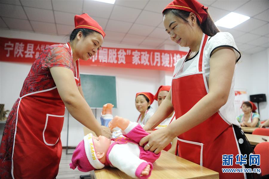 陕西省宁陕县新世纪职业培训学校的月嫂培训老师(左)在为学员做示范(7月13日摄)。近年来,宁陕县结合市场需求,开设“就业技能培训班”,免费为辖区内贫困户、下岗失业人员等妇女群体提供家政、电商、烹饪等技能培训,并就近推荐就业。 新华社记者张博文摄