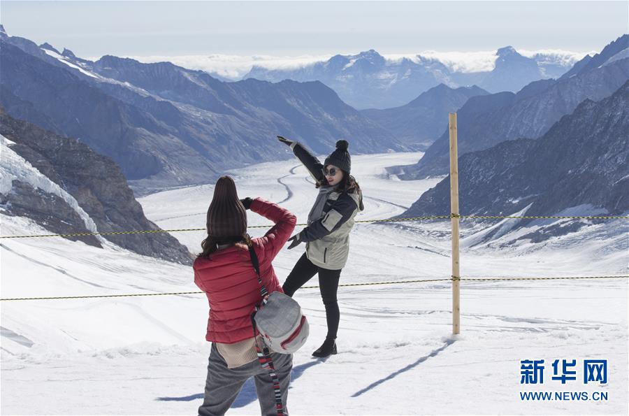 中国游客在瑞士因特拉肯的少女峰景区游览(10月4日摄)?!笆弧被平鹬芷诩?国内游客超过7亿人次,出境旅游约700万人次,双双刷新了纪录。 新华社记者徐金泉摄