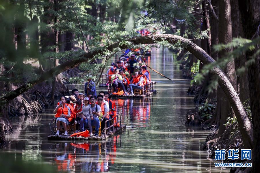游客在江苏兴化“水上森林”中乘船游览(10月4日摄)。“十一”黄金周期间,国内游客超过7亿人次,出境旅游约700万人次,双双刷新了纪录。新华社发(汤德宏 摄)