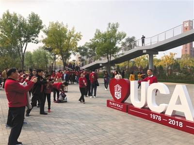 昨日,中国科学院大学迎40周年校庆,校友们在校庆标志处拍照留念。新京报记者 王俊 摄