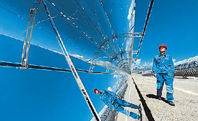 图为青海省海西蒙古族藏族自治州德令哈市的中广核太阳能开发有限公司德令哈50兆瓦光热发电项目现场,一名工人在站内巡检。张宏祥摄(新华社发)