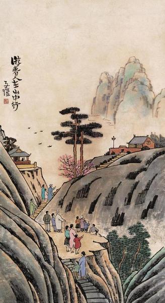 我们可以看到,整幅画的格调是悠闲的,向我们传达的理念也是悠闲,即是画面画的是什么,主题表达的就是什么,这种较为写实的手法,与古代同类题材的表现手法相类似。在画风上,也相对古朴,山石的墨迹有故意做旧之嫌,笔法偏向了传统,颇严谨,似工笔。如果不从游人的服饰来观察的话,我们就不敢下“这是一幅现代画”的论断。
