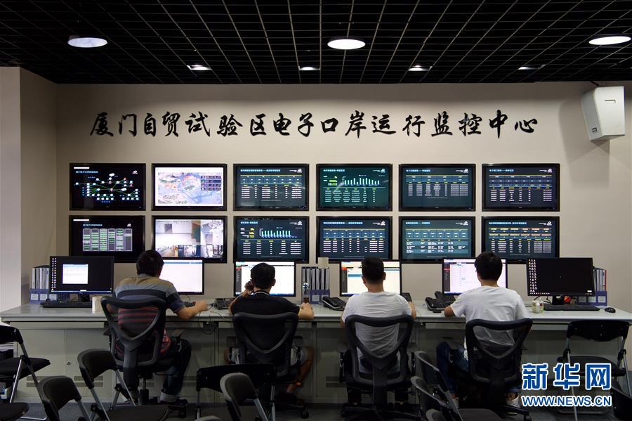 10月10日,厦门自贸试验区电子口岸运行监控中心工作人员在监控平台运行情况。 新华社记者 姜克红 摄