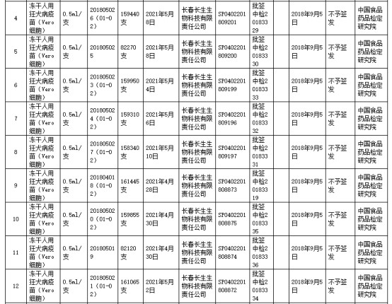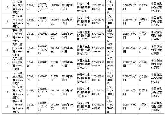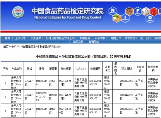 中国食品药品鉴定研究院今日在官网发布了《中检院生物制药不予批签发信息公示表》。公示表显示,其所公布的20批不予批签发的人用狂犬病疫苗,全部为长春长生生物科技有限责任公司生产,总计拒签量达265万余支。