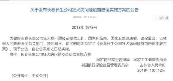 而昨日,国家药品监督管理局、国家卫生健康委员会、中国银行保险监督管理委员会、吉林省人民政府四部门联合发布《关于发布长春长生公司狂犬病问题疫苗赔偿实施方案的公告》,责令长春长生公司设立专项赔偿金,对问题疫苗受害者最高赔偿65万元一个人。