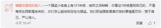 网友@蝙蝠侠是我的超人:一个强盗小偷身上有101块钱,被抓之后辩解,你看这1块钱是我自己的,不是每样东西都是抢来的,你们怎么能给我定性为强盗。他们那些国家最喜欢做的事情是双标:宽于律己、严以待人。
